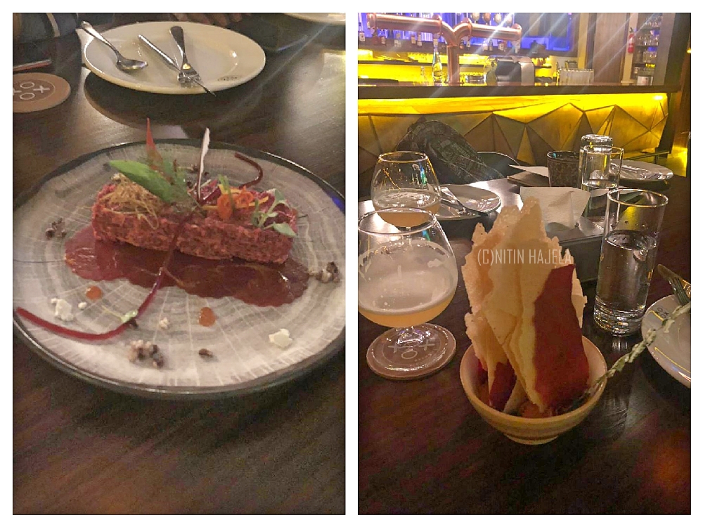 During our recent visit to this picturesquely magnificent brew-mill , we tried the brew paired 6 course pre-fixe menu. Beginning with Belgian Wit paired with Dehydrated Dosa , that resembles more like mangalorean kori roti in two variants , normal and beet root , served with delicious tomato & coconut chutney , the next course was the Japanses Dry Blonde Ale brew served with delightful Honey chilly glazed Beetroot Carpaccio in yogurt dressing.